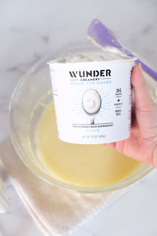 - Add Quark (or Greek yogurt or pureed cottage cheese). Mix on low until well combined.