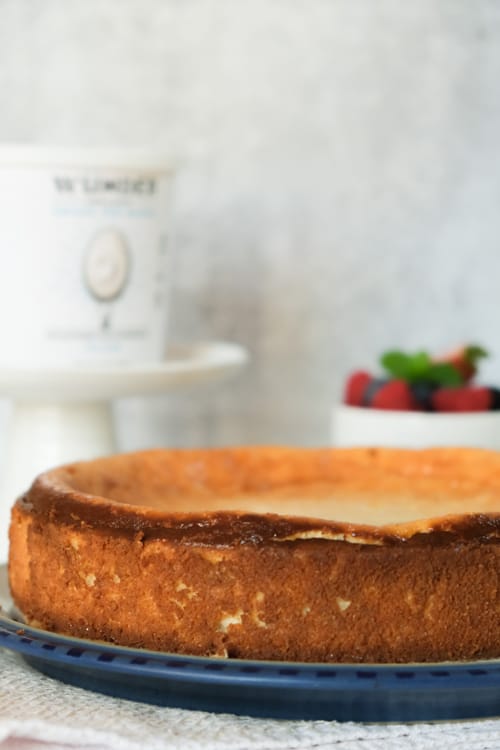 When you’re ready to serve the cheesecake, let it warm to room temperature. Serve with fresh whipped cream on the side. Enjoy!