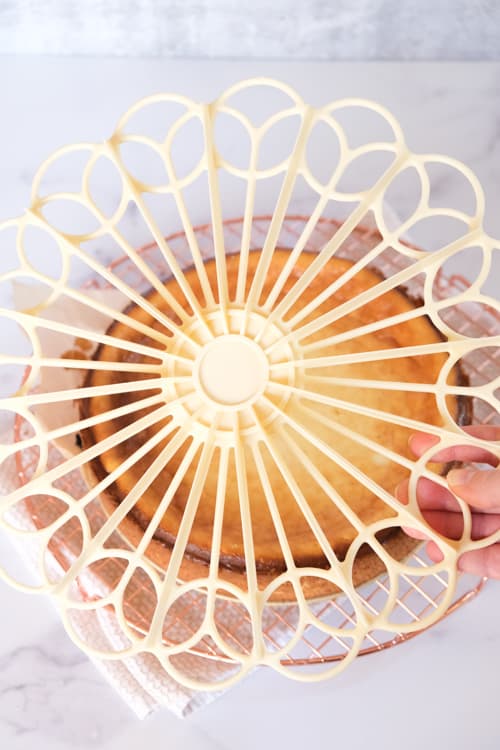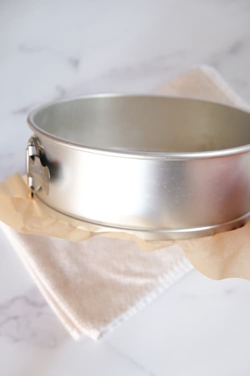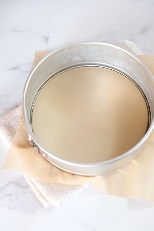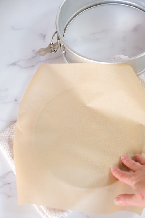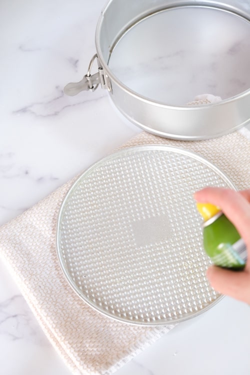 Take the ring off your springform pan, spray the bottom of the pan with cooking spray and then lay a piece of parchment on it. (Or use a round Silpat mat!)