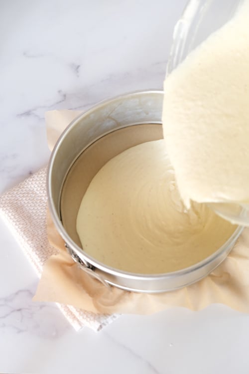 - Pour cheesecake batter into the prepared springform pan.