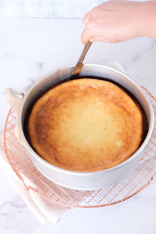 - Let the cheesecake cool in the springform pan for a few minutes. Carefully run a knife around the edge of the pan and then slowly release the springform pan. Let the cheesecake cool for several hours or overnight in the fridge. The cheesecake will firm up as it cools.