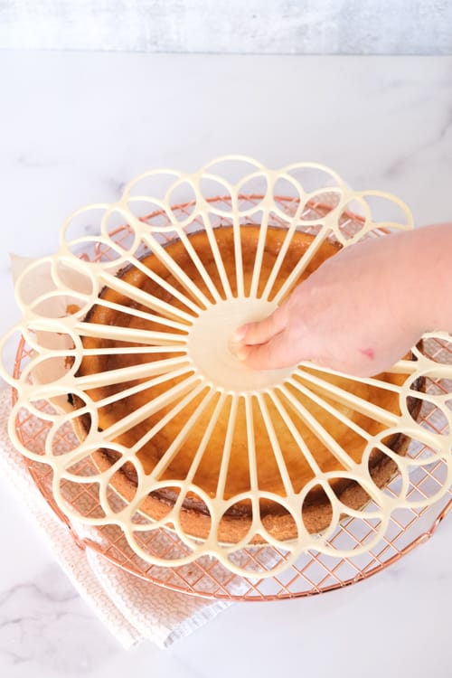 I couldn’t find the cake marker I bought on Amazon (I think it was an add-on item) but I found one that’s even better! This cake marker is double-sided so you can slice your cake in either 14 or 18 portions. This one gives you 10 or 12 portions. There are a bunch of cake markers on Amazon – from plastic to metal, for cakes, brownies, and pies.