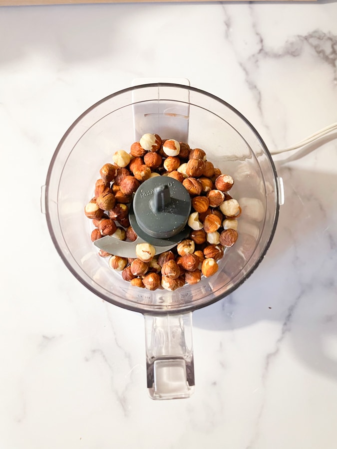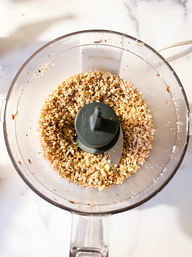 - Use a food processor to grind the almonds and hazelnuts until they're like crumbs. (But be careful that you don't grind so long that they turn into nut butter! It's ok if you have some larger nut chunks.They don't all have to be the same size.) Set ground nuts aside.
