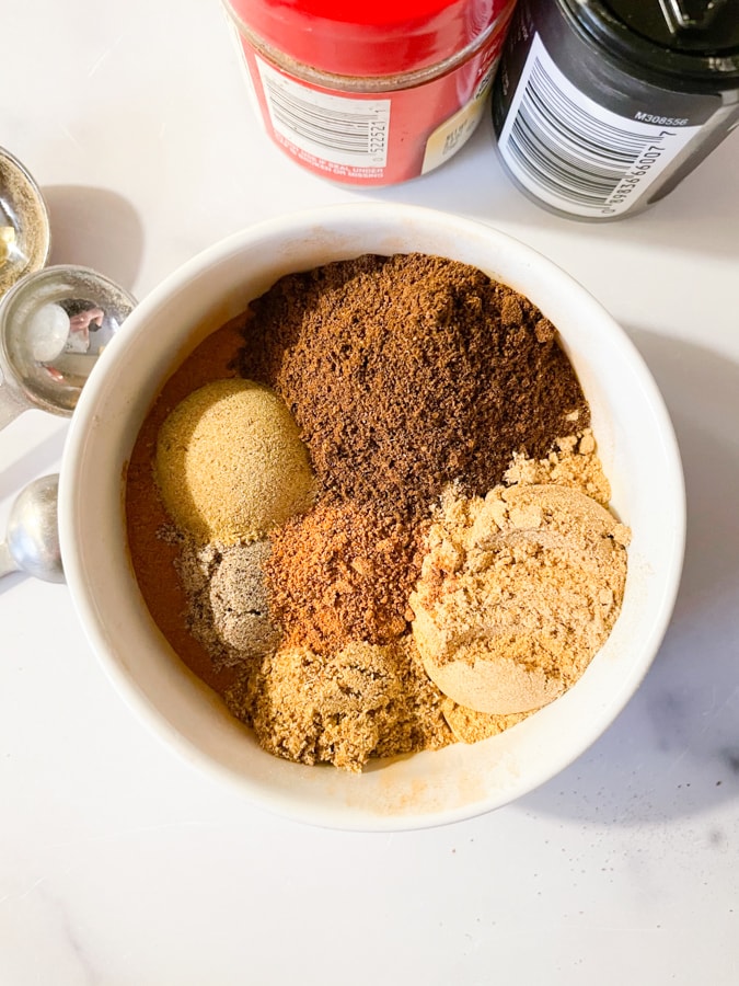 These warming spices include cinnamon, cloves, anise, cardamom, coriander, ginger, nutmeg, and sometimes also allspice and mace. You can buy this spice mix or make it at home – keep reading for the recipe!