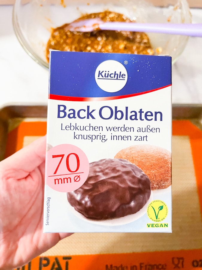 Oblaten are round thin wafers that the Lebkuchen cookie dough is placed on before baking. Usually store-bought, Oblaten are considered an essential baking ingredient in Germany when making soft, round Lebkuchen cookies.