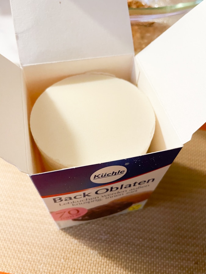 The first step is to order the Oblaten wafers. I got mine here on Amazon and they arrived in a day or two. These wafers form the bottom of your Lebkuchen cookies (you’ll spoon the cookie dough on top). You’ll get enough Oblaten to make several batches of cookies.
