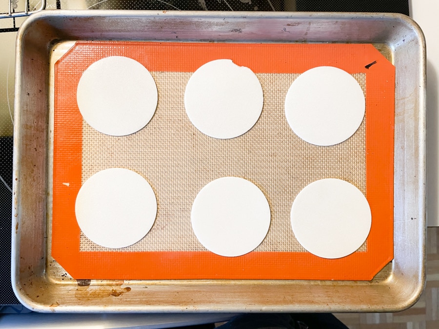 I recommend baking one or two cookies to start with so you can see how they turn out. As they bake, they might spread over the wafer a little bit, but that’s ok. It’s also ok if the baked cookies don’t completely cover the wafer – just break that part off.