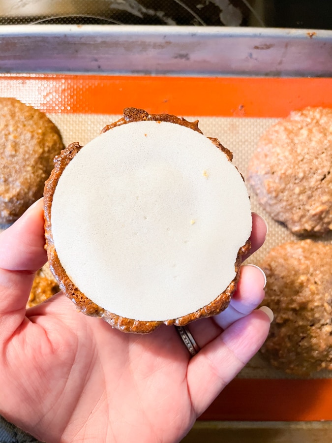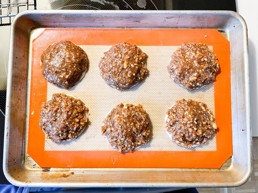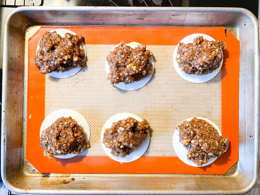 If using the 70mm size, spoon 2 tablespoons dough onto the middle of each wafer. If your dough immediately flattens out and spills out over the wafer, add more ground nuts to thicken it up (try grinding another 1/4 to 1/2 cup).