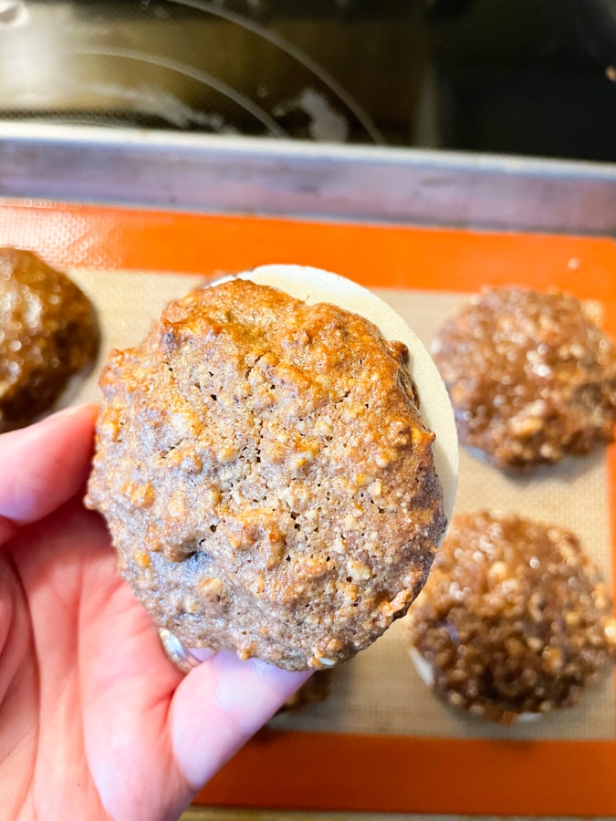 See the cookie in the upper left-hand corner in the photo below? I used damp fingers to spread out and shape the dough. You can see that the finished cookie is smoother than the others. If you’d like your cookies to be smoother, use that method.