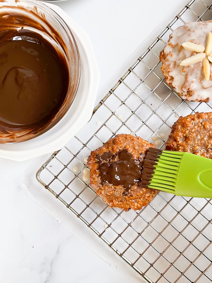 Use a pastry brush to apply the sugar or chocolate glaze to the top of the cookies. You can also dip the cookies in the glaze (I found it easiest to use the pastry brush).