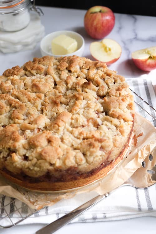 I used about five apples in my cake but you can add more if you’d like. The streusel on top is a little different compared to the streusel I use in my German Plum Cake – this streusel has ground almonds.