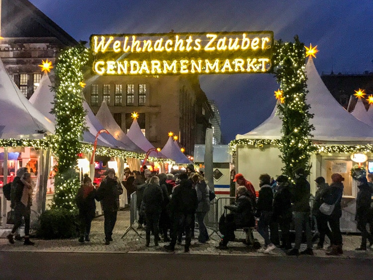This market is arguably one of the most beautiful in Berlin surrounded by French and German cathedrals and a concert hall. It’s lit up with glowing stars on every tent and you’ll find plenty of Christmas ornaments, tasty food, and Glühwein (mulled wine). All of this makes the Gendarmenmarkt Christmas Market very popular and one of my favorites.