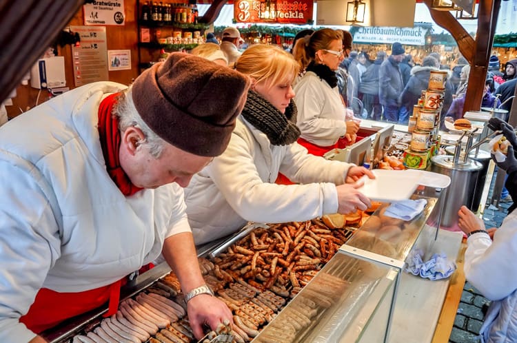 As with other Christmas markets in Germany, food is a star in Nuremberg. One of the most popular items are Nurembergers, small marjoram-flavored pork sausages that have been staples in Nuremberg for centuries. They’re most often sold as three in a bun with a bit of strong mustard.