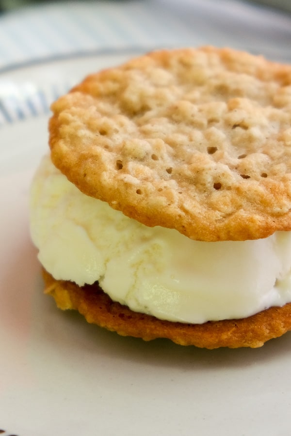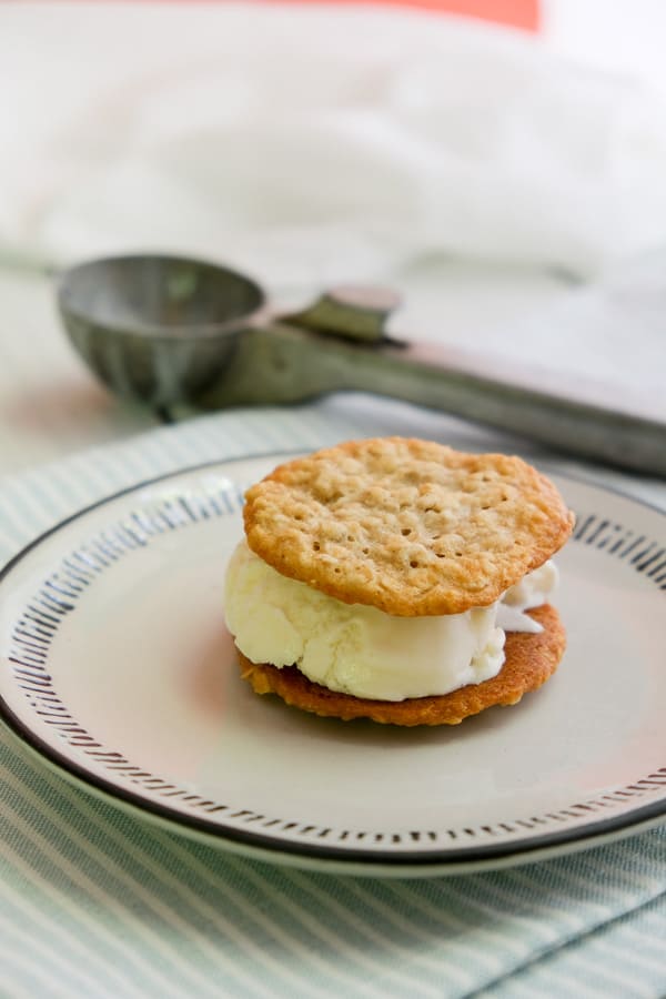 Tip: prepare and freeze the ice cream sandwiches a few hours before you want to serve them so the ice cream has time to harden. They’re much easier to eat that way.