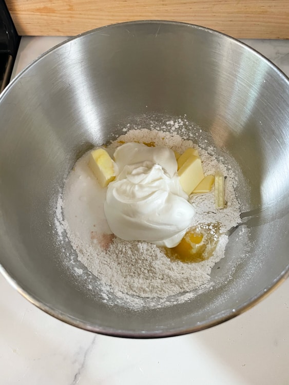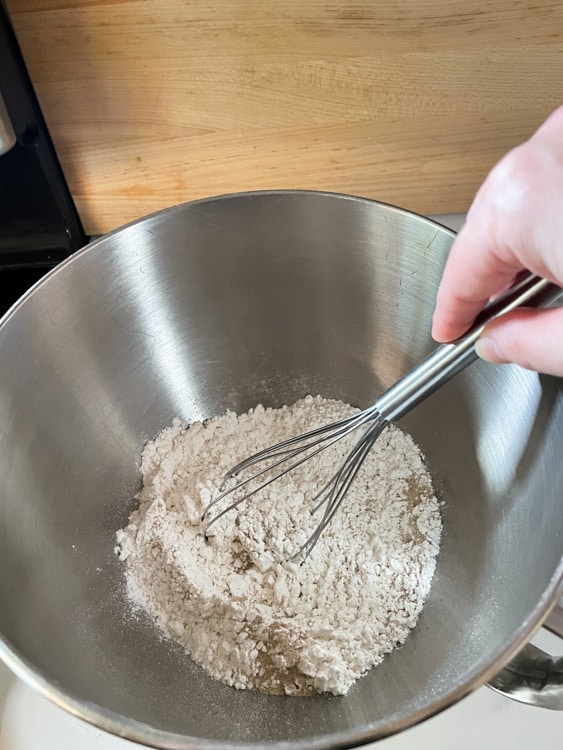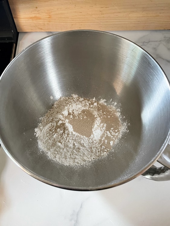 First, add flour and yeast to the bowl of a stand mixer and whisk until combined.