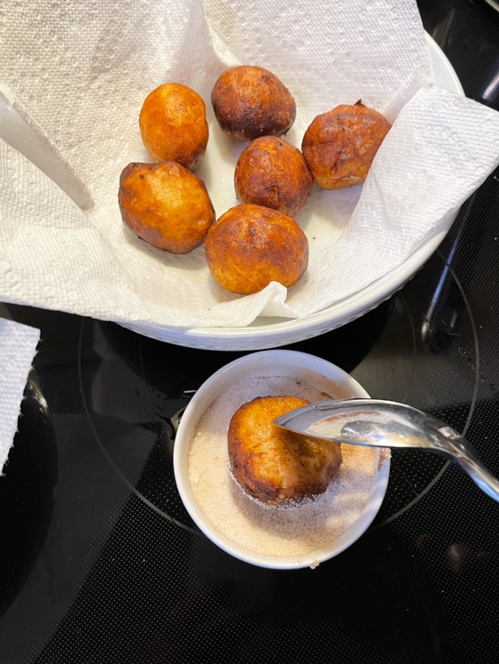 When the Quark Balls are golden brown, take them out of the oil and place on a paper towel. When you can comfortably touch the Quark Balls with your fingers, roll them in sugar (or cinnamon sugar, vanilla sugar or speculaas spice sugar).