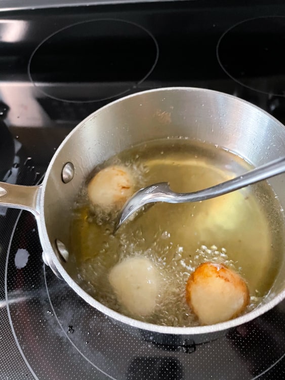 Carefully drop 2 or 3 dough balls into the hot oil. Watch the balls carefully! Use a knife or spoon to flip them over once one side is golden brown.