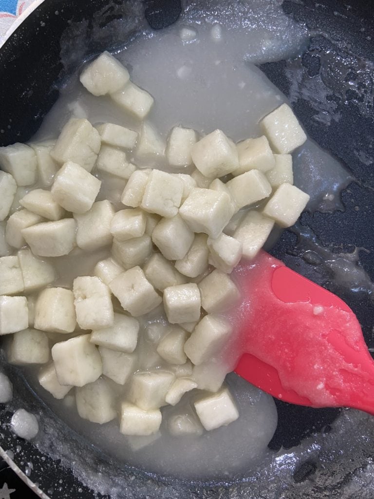 - Once the sugar has completely dissolved and the syrup is simmering, add paneer pieces and stir gently and continuously.