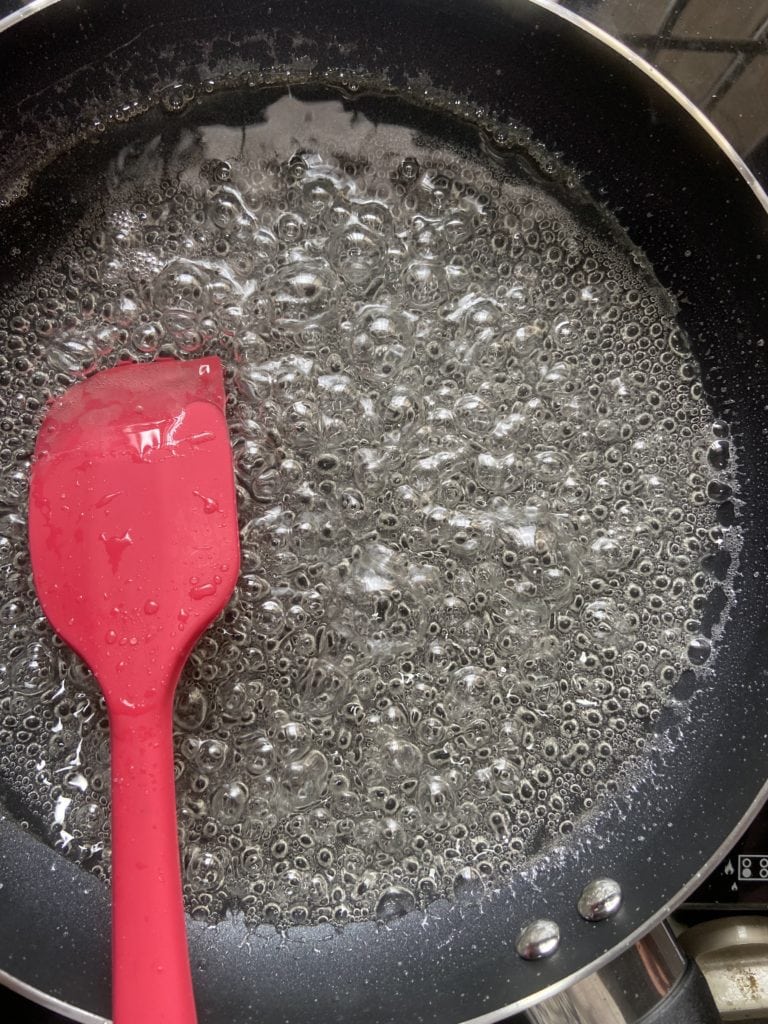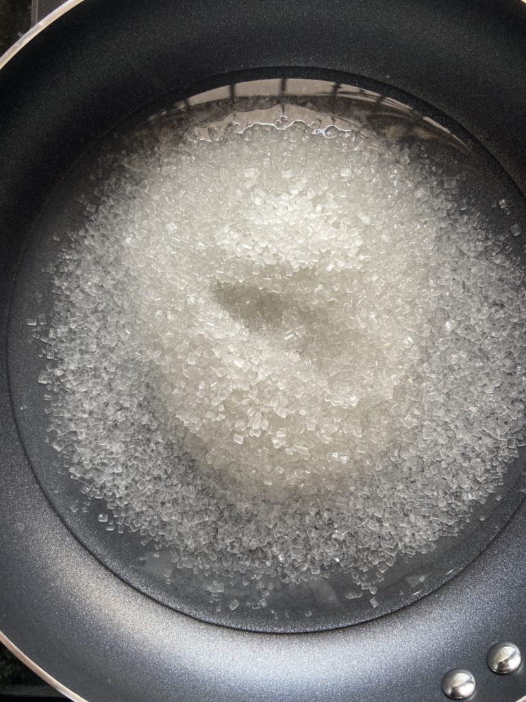 - Add sugar and water to a non-stick pan. Bring to a simmer over medium heat.