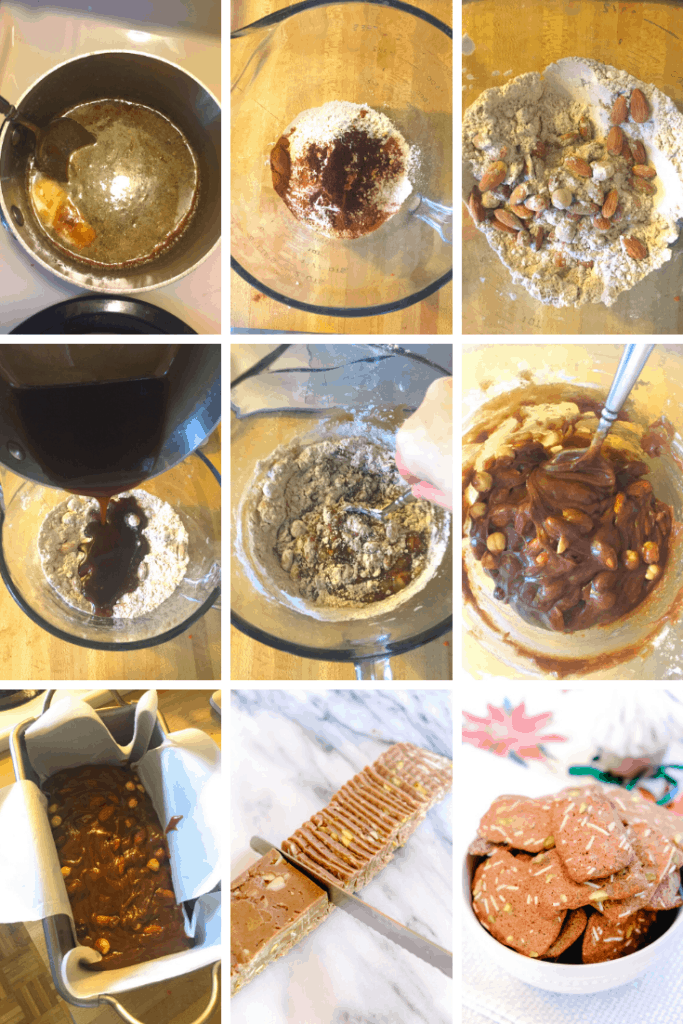 For this second round I used molasses instead of corn syrup and I sliced them thicker. I used the same nut combo – whole almonds and hazelnuts. This version looked like this: