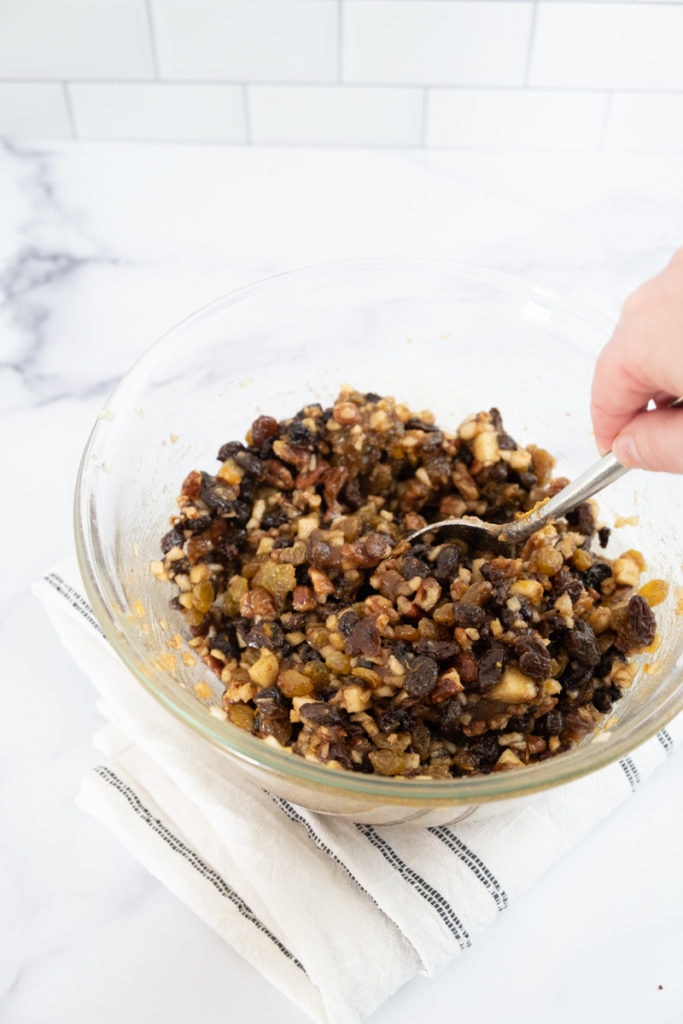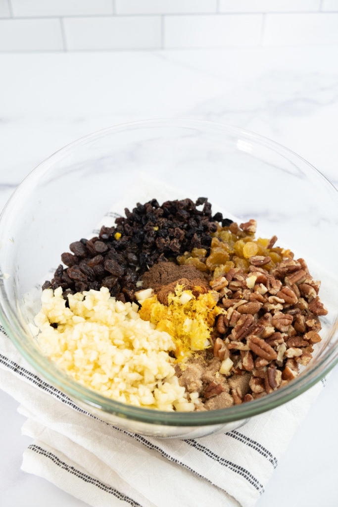 Add raisins, golden raisins, currants, apples, orange and lemon zest, candied zest, brown sugar, spices, pecans, melted butter, and brandy in a mixing bowl.