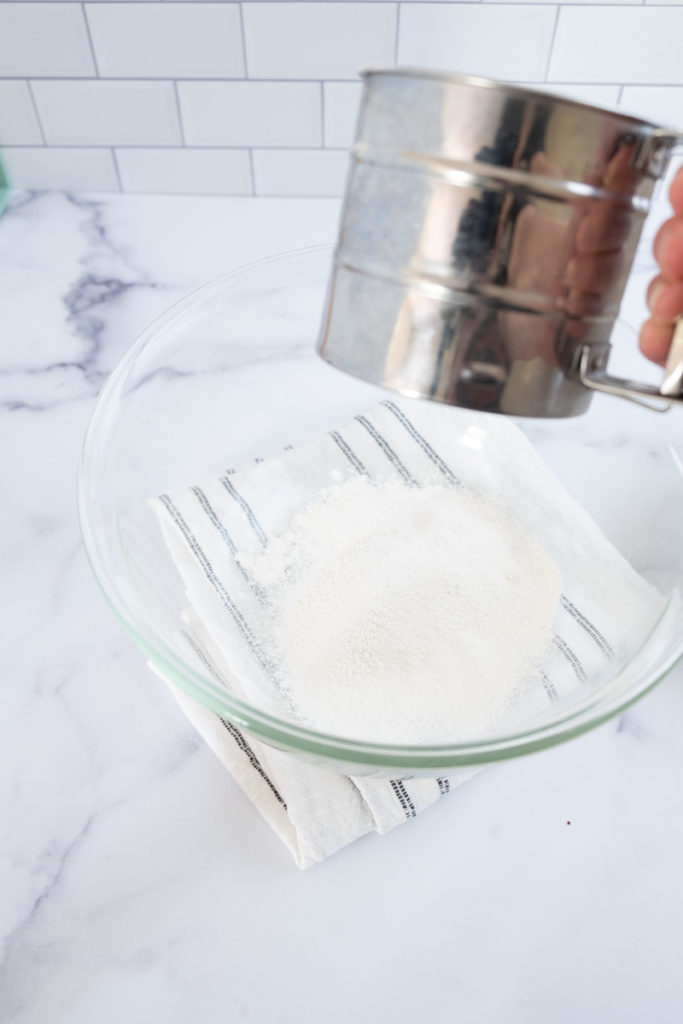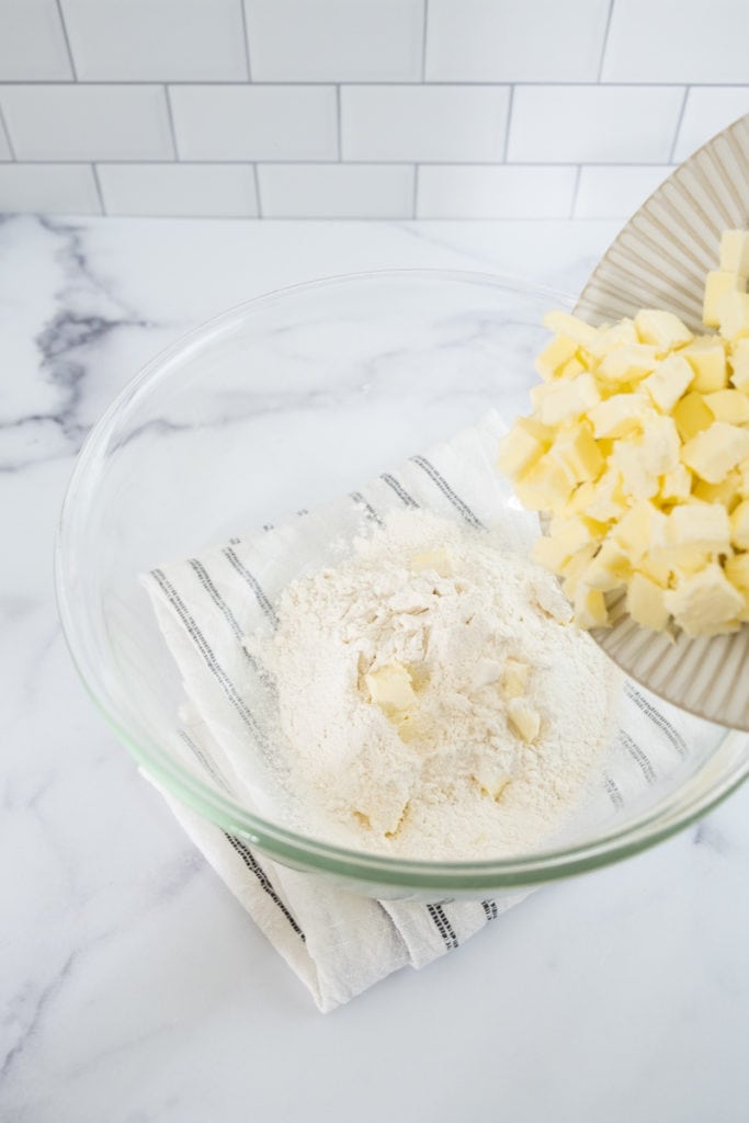 Sift flour and salt into a mixing bowl. Add the cold cubed butter. Rub butter into flour.