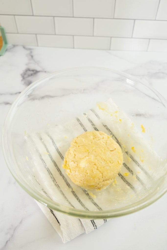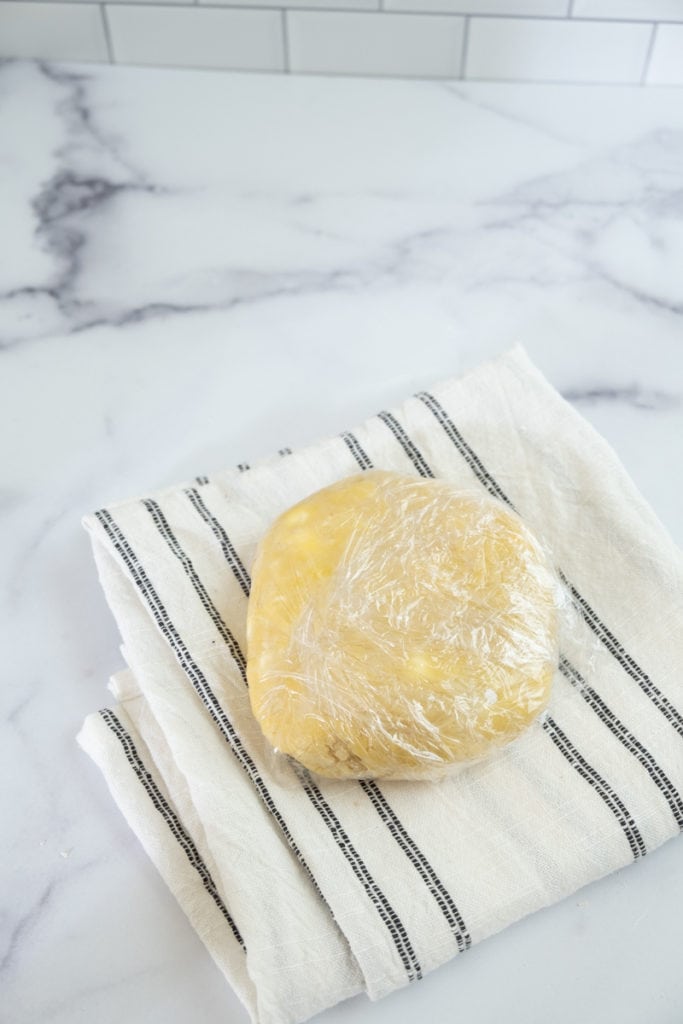 - Form dough into a ball, press into a disk shape, then wrap in plastic wrap and chill in refrigerator for 30 minutes.