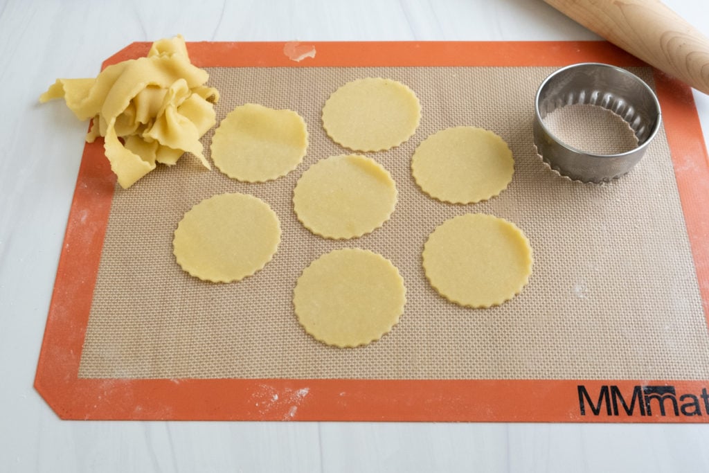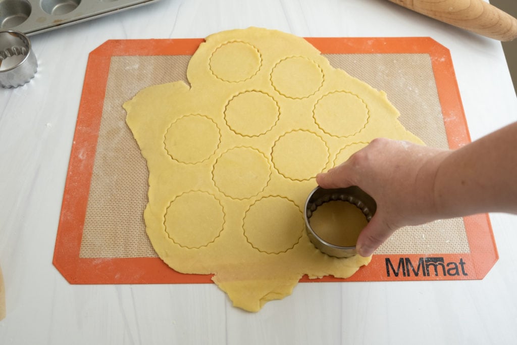 - Roll out dough to 1/8 inch [3mm] thick. Use a cookie or biscuit cutter a little larger than your mini muffin tin to cut rounds out of the dough.