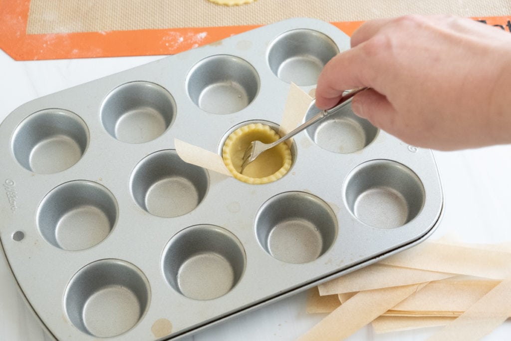 - Press dough into mini muffin tin. Prick the bottom of the dough a couple times with a fork.