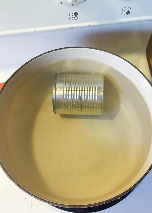 It’s critical that the can is ALWAYS completely submerged in water. I left a container full of water next to the pot so I could quickly refill the pot. I also set the timer to go off every 20-30 minutes so I’d remember to check that the can was still covered with water.