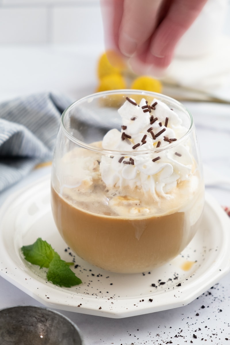 - Add whipped cream and top with chocolate sprinkles. Serve immediately with a tall spoon and a straw.