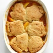 This easy Gluten-Free Peach Cobbler is vegan, allergy-free, made with sweet fresh peaches, and a buttery biscuit topping! A homemade old-fashioned Southern dessert recipe that's simple and quick, but out of this world delicious! Don't forget to top your "hot from the oven" serving with some dairy-free vanilla ice cream!