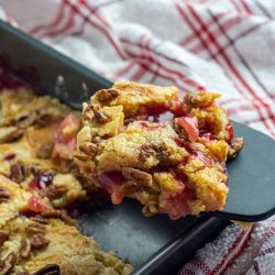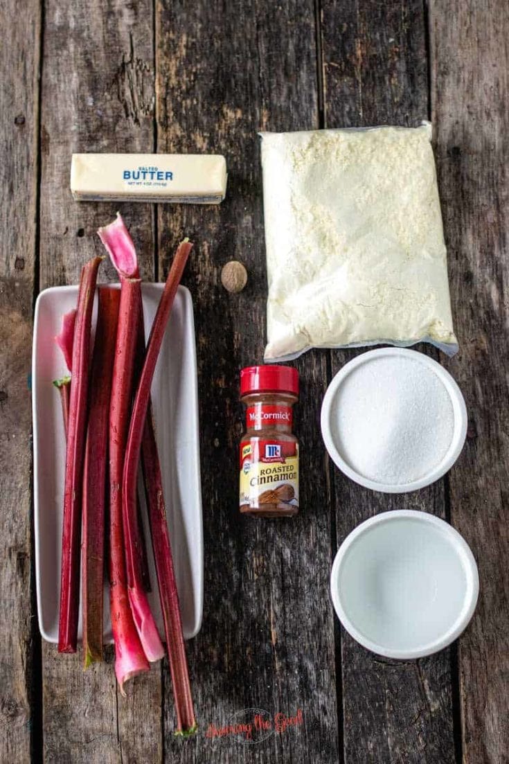 Rhubarb Dump Cake without jello is the one-pan dessert that uses either fresh rhubarb or frozen rhubarb, yellow cake mix, melted butter and a sprinkle of cinnamon & nutmeg.