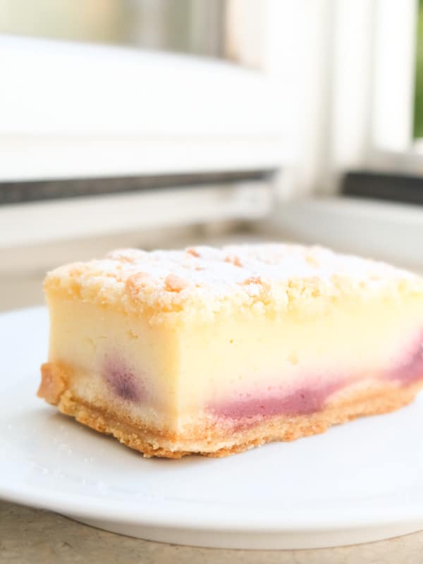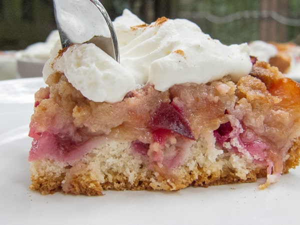 German plum cake is amazing, especially topped with a dollop of fresh whipped cream. The baked plums get all soft and sweet and the cake base and buttery streusel topping balance out the sweetness so well. If you’re in Germany during plum season, give this cake a try. Or make German plum cake at home with my easy recipe!