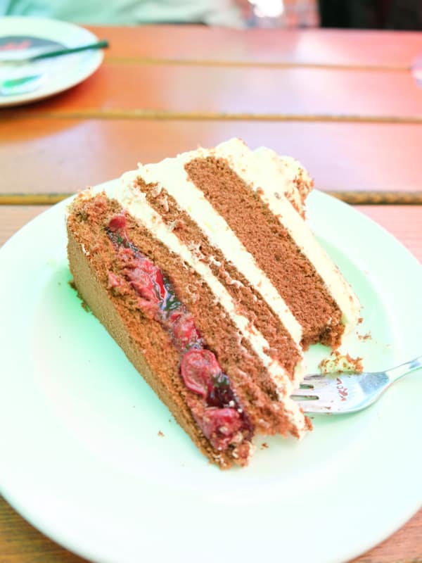 I couldn’t go to the Black Forest without enjoying a piece of traditional Black Forest Cake! Four layers of chocolate cake, a layer of cherries, and three layers of whipped cream = a delicious afternoon break on a very hot summer day.