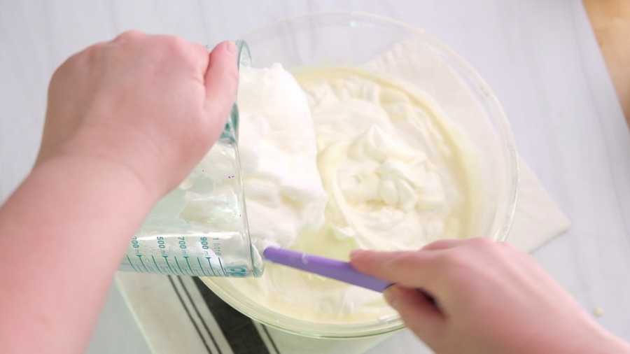 - Carefully fold the heavy cream and then the egg whites into the batter.