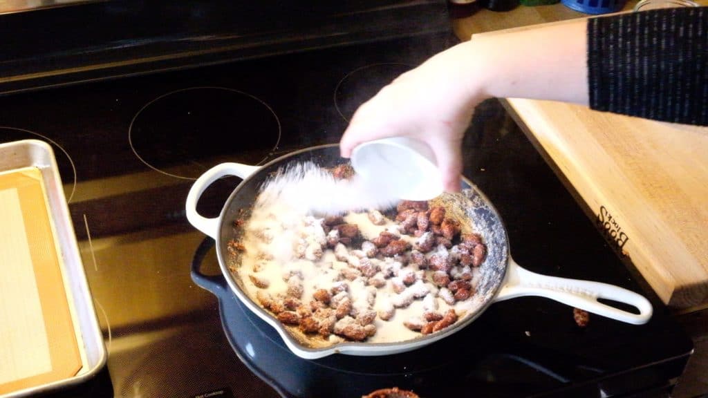 (Remember, these photos are showing a half batch of almonds. If you make a full batch, you’ll have more almonds in the skillet.)