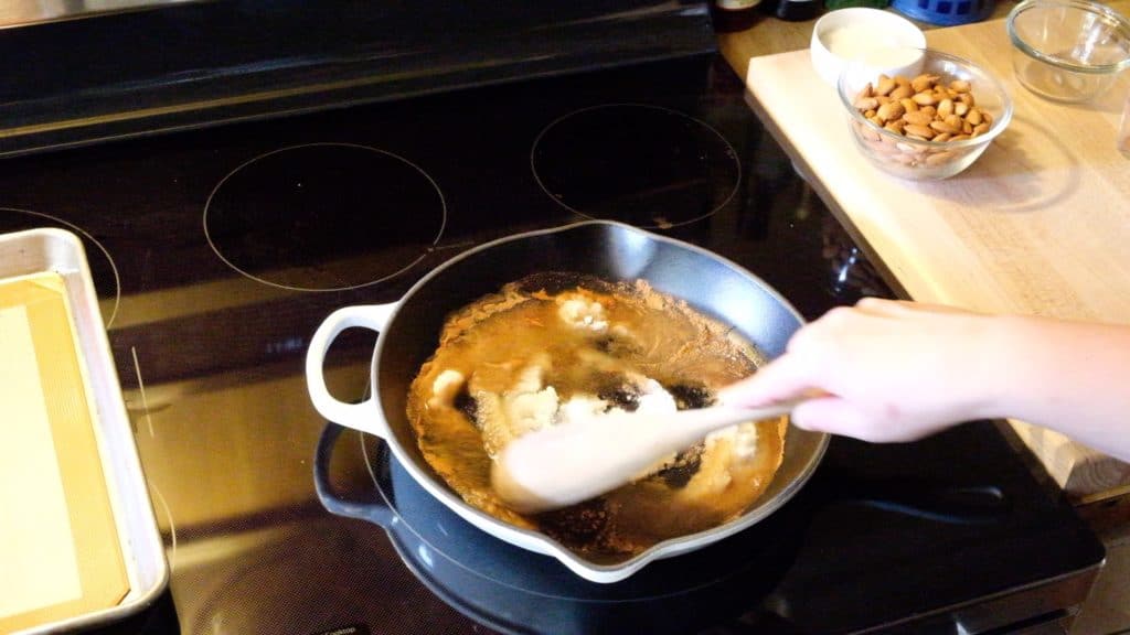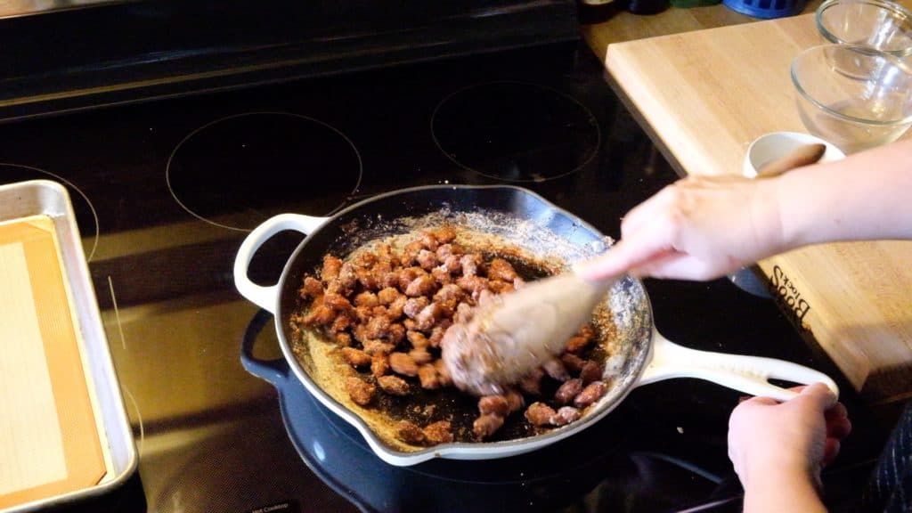 I’ve made these almonds many times now, and while I’ve used my Le Creuset dutch oven and a saucepan, I’ve had the best results with my fairly new Le Creuset cast iron skillet. If you have a cast iron skillet, I recommend using it.