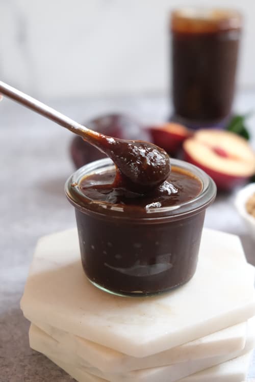 This plum butter is easy to make in the slow cooker and delicious spread on bread, swirled into yogurt, as an oatmeal topping, and more!