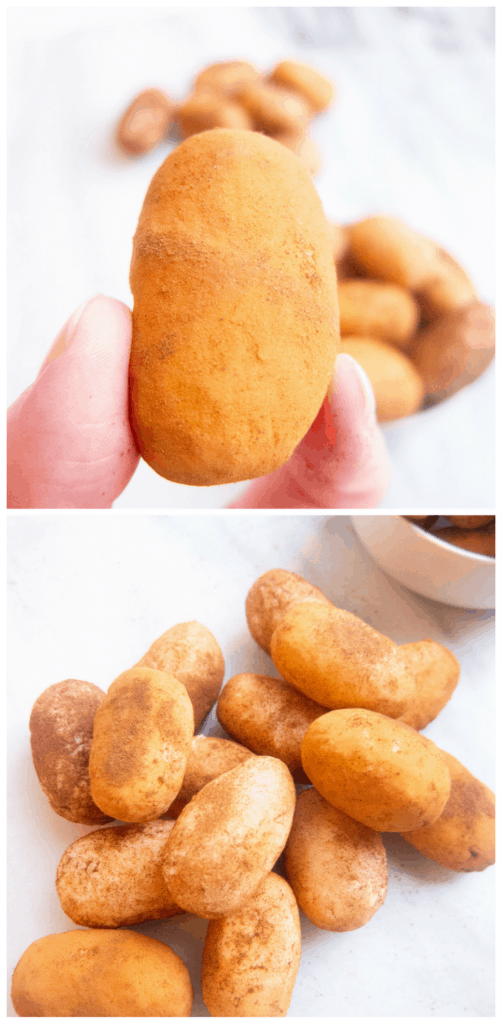 - Roll into small potato shapes, then roll each in cinnamon or cocoa powder. (I prefer cinnamon.) Chill until set. Store in an airtight container.