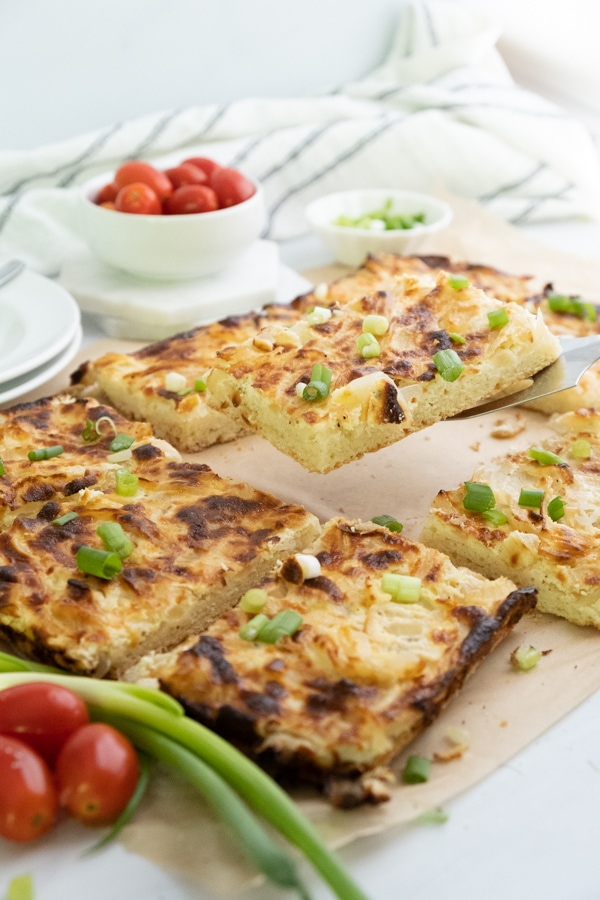 This classic savory German Onion Cake is a delicious pizza alternative! It's simple to make and a crowd-pleaser.