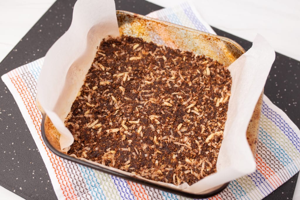Press the coconut mixture into an ungreased 8×8 pan. I like to line my pan with parchment paper to make it easy to lift out of the pan.