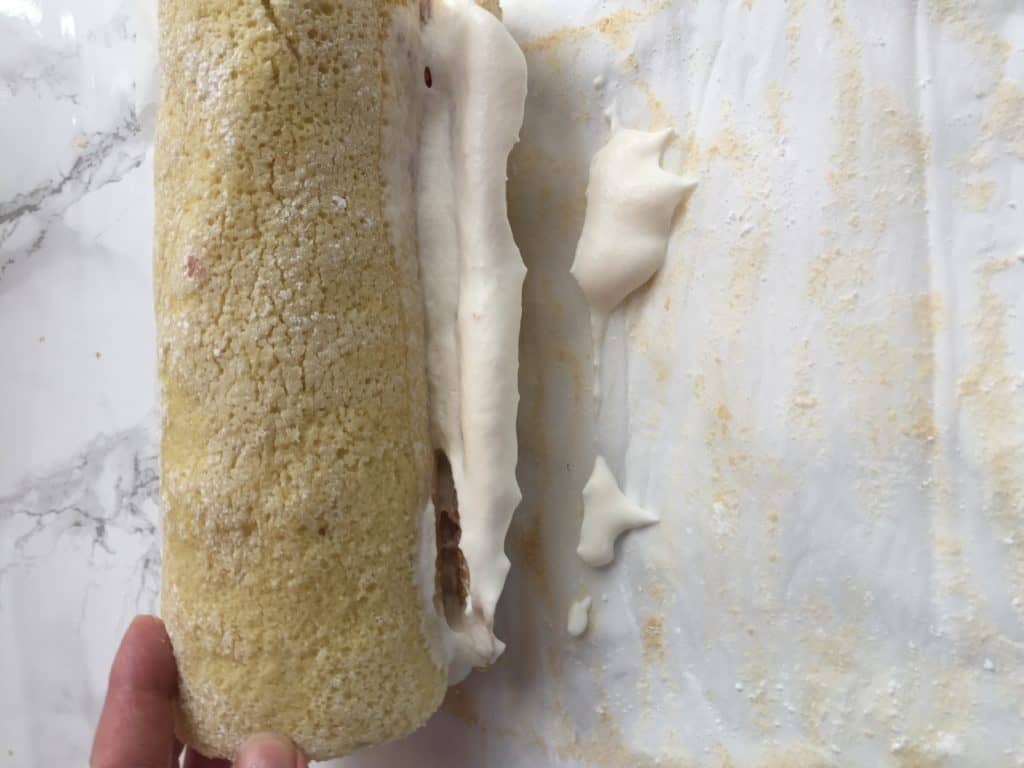 Note; I added a little too much whipped cream to my roll and it spilled out after I rolled it up. It’s easy enough to fix – just wipe it off with a spatula. But it’s better to leave a whipped-cream-free border around the sides when you spread on the whipped cream.