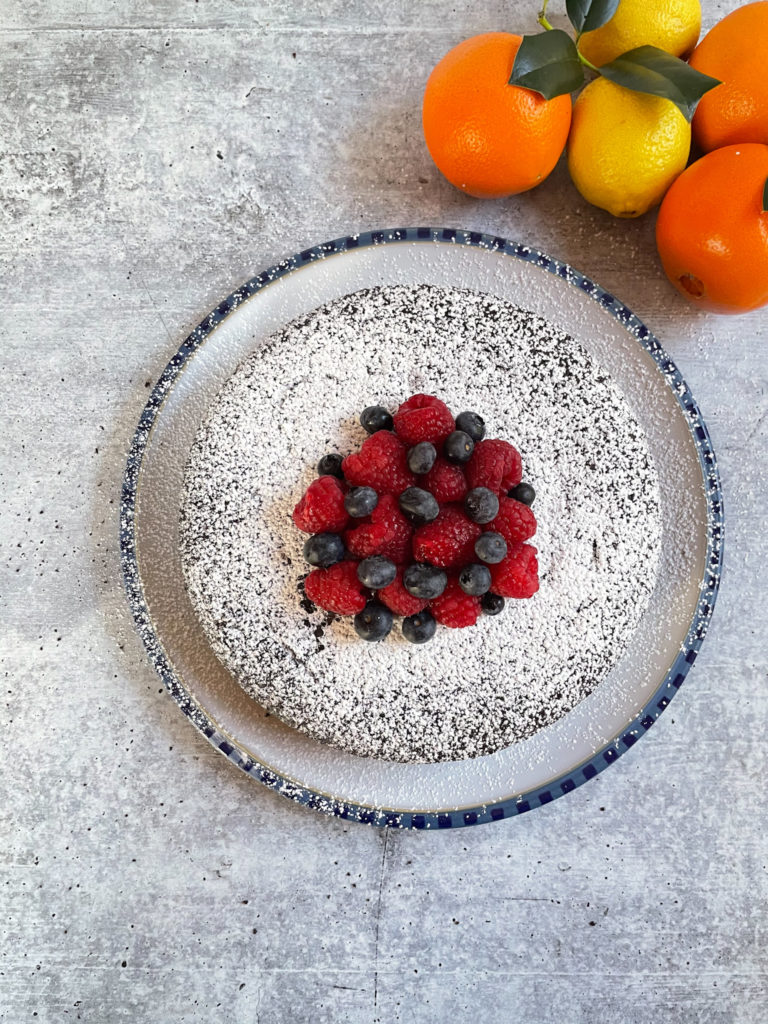 - I topped the cake with powdered sugar and served it with whipped cream and fresh berries. It tasted great on its own, though, and didn’t really need anything additional.