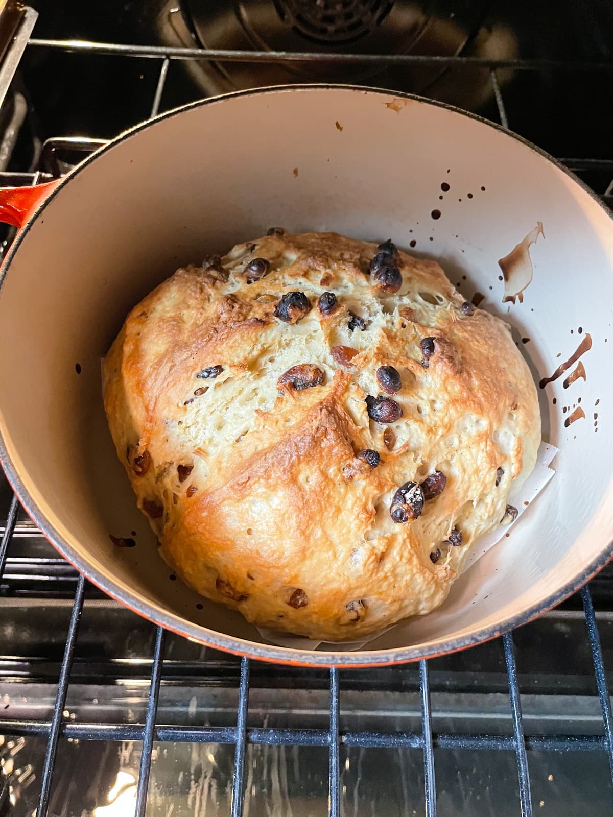 If your bread has already cooled a bit, turn the oven off and place the covered Dutch oven back in the oven for a few minutes.