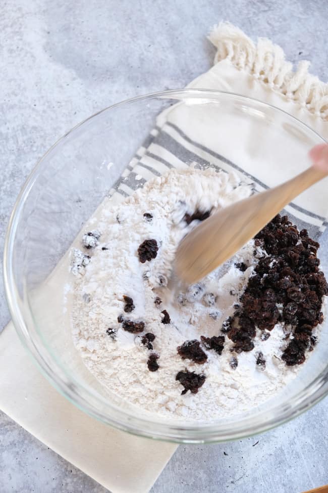 Then add the dried currants (or raisins, dried cranberries, etc) and mix with a wooden spoon.